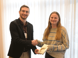 The winner of the Al Dextrase Award for Best Student Poster Presentation at the 2026 AFS-OC Annual Meeting was Emma Geffros from Trent University. Emma (right) received her award from Ontario Chapter President Connor Reid (left). Her poster was titled “Insights from Ontario’s Broad-scale Monitoring program: Trends in sport fish abundance” and the abstract is available in the 2026 AFS-OC Conference Program.